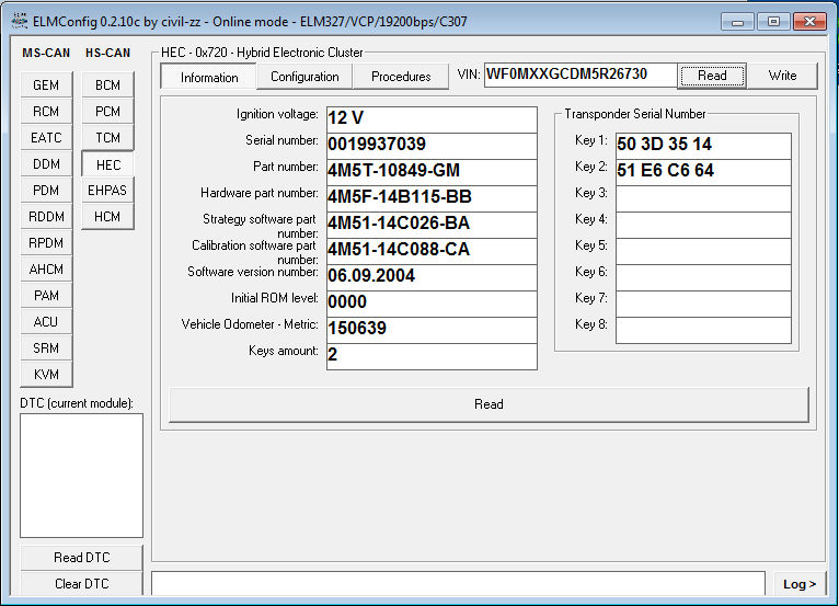 Připojil jsem ELMa ke starám, printscreenoval konfiguraci. Nasadil nové, naťukal konfiguraci i VIN. S největší pravděpodobností jsem to posral