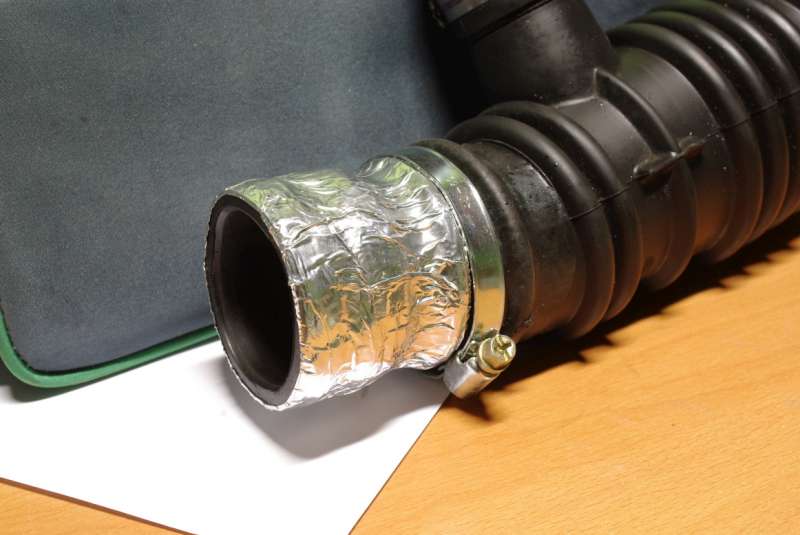 Testu průtoku netřeba - prasklá hadice k turbu, praskla pod sponou až po tom, co jsem jí tam vracel, takže jsem to neviděl. Stav viz foto - kvalifikovaně opraveno viz další foto. Očištěno, odmaštěno, omotáno několika vrstvami samovulkanizační gumové pásky a přes to ještě samolepící hliníkovou fólií.
