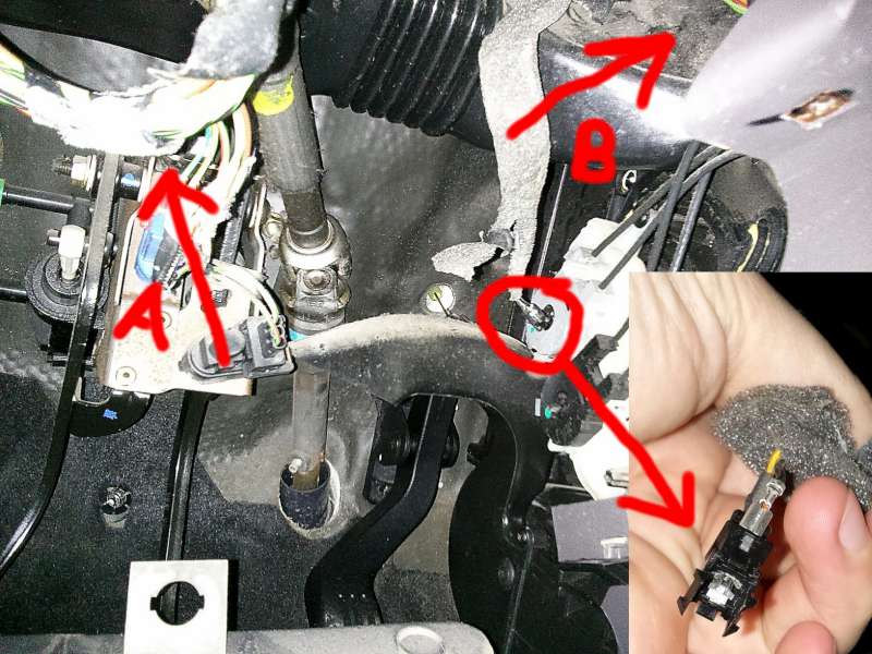 Pod cernou izolackou najdes jen prepojeni vodicu. Je to napajeni spinacu na pedalech. To druhe (B) netusim, ale objimka na zarovku osvetleni to neni. Ta je seda valcova - pasuje do kruhove diry se dvema zarezy, ktera je videt na fotce vlevo dole ...