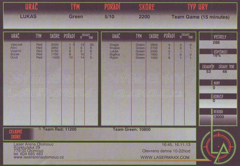 No to je dost, že aspoň někdo přidal svůj výsledek z laserové bitvy :perfect: , i když to chvilkama vypadalo, že jste se do sebe pustili ručně, ale Buči vysvětlil, že párkrát spadl.