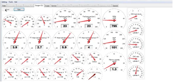 Rozhodol som sa vymenit repasovany vstrekovac za povodny. Demontoval som repasovany, zalozil povodny, nakodoval a nastartoval. Nepravidelny chod zmyzol, v celom spektre otacok. Namerane hodnoty v diagnostike vyzerali takto: