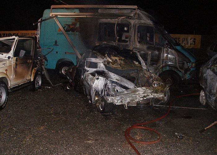 "Řidič Peugeotu 306 nepřizpůsobil rychlost jízdy a při předjíždění a následném zařazování do pravého jízdního pruhu dostal smyk, který nezvládl. Vyjel mimo silnici, kde narazil do lanových svodidel, pak do oplocení autobazaru a následně do šesti zaparkovaných vozidel,“ popsal nehodu mluvčí policie Jiří Prouza.Peugeot začal hořet a oheň se rychle rozšířil na dalších sedm zaparkovaných aut. Na místě uhořel devatenáctiletý spolujezdec, jednadvacetiletý řidič byl zraněn lehce."
