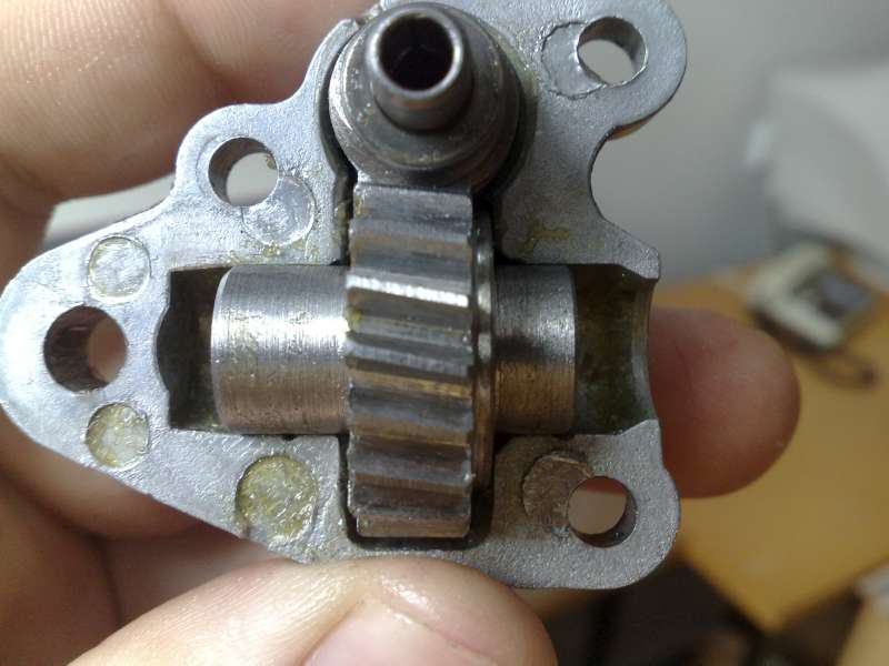 4.sundat závlačku 5.vyrazit,nebo zmáčknou malýla kleštěma a vytáhnou pružný kolík 6.odšroubovat 3 šrouby a sundat kryt.Vyndáme hřídel s ozubeným kolem.(ve vnitř ozubené kolo na hřídely a plná podložka-dát pak zpět!)