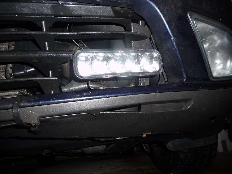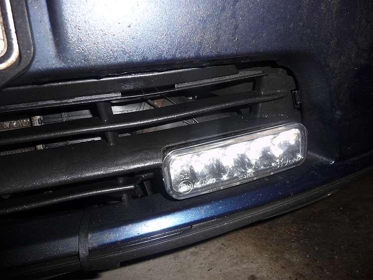 Jen montáž do předního nárazníku mám jinak. Tak dlouho jsem rozměřoval, až to udělal jak je to na fotkách. Malou bruskou jsem vyřezal v mřížce vepředu díru – vůbec jsem to nerozdělával, přímo na autě. Pak jsem zkusil šílené řešení – jen pokus – přilepil jsem je dolů na nárazník (na to lakovaný) lepící páskou co byla součástí balení SDS a ještě jsem to do plastu nárazníku chytl vrutama. Prostě provizorní řešení až mně napadne něco lepšího a nebo až uletí černý plast pod nárazníkem, který tam mám chycený jen páskama po křupanci o obrubník. Takže když byly SDS na autě čerstvý, pořád jsem kontroloval jestli to drží. Drží, pořád, SDS aj ten spodní plast