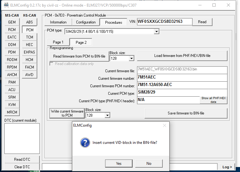 takze as-built neslo, neprecitalo mi ani VIN, ale mal som ulozenu PCM konfig, z nej som to nahral a malo by to tam byt. ked dam Load fw, opyta sa ma toto. teraz prosim ano alebo nie?