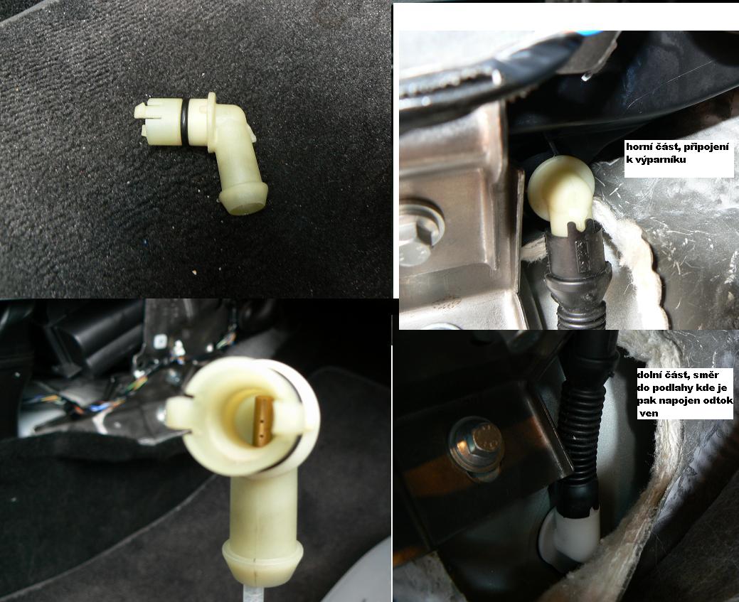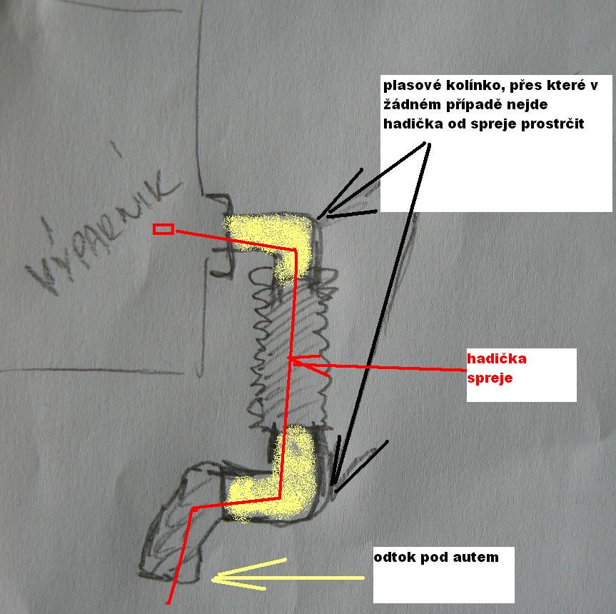killerhammer: Z pod auta nemé cenu ten sprej aplikovat. Nevím jak u Mondea, ale u Focusu II. se prostě odtokovou hadičkou zpod auta k výparníku nedostaneš. Přes dvě plastové kolínka se ta hadička od spreje zalomí. Viz můj amatérský obrázek. Případně se koukni na mé foto na 1.str tohoto vlákna. Přístup z interiéru je naopak úplně super a je to otázka max. 5 minut.