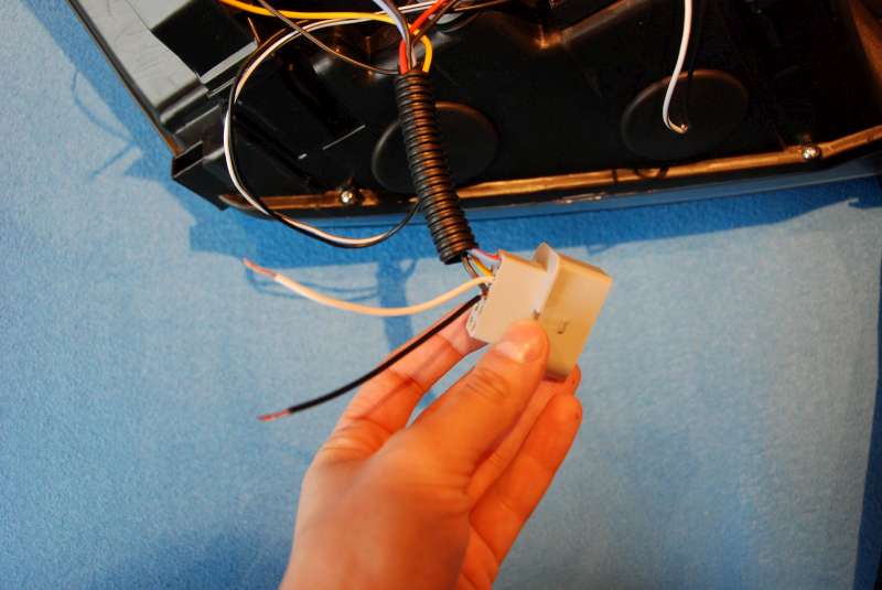 ) z posledni fotky. Sedel tam dobre, ovsem potrebuje napajeni. Vedou k nemu 3 kabliky. Hnedy -, cerny + a cerveny, ktery je pripojeny k + u potkavacky. Tak jsem vytahnul z puvodnich svetel i ten maly konektor pro napajeni motorku. Musel jsem ho ale ustrihnout (byl ve velkem original konktoru zrejme zalisovany, neslo s tim hnout) a ted je potrebuju pridat na sve misto do konektoru novych svetel. Nevite nekdo, jestli je mozne koupit zvlast ty male hranate piny, ktere jsou uvnitr konektoru??