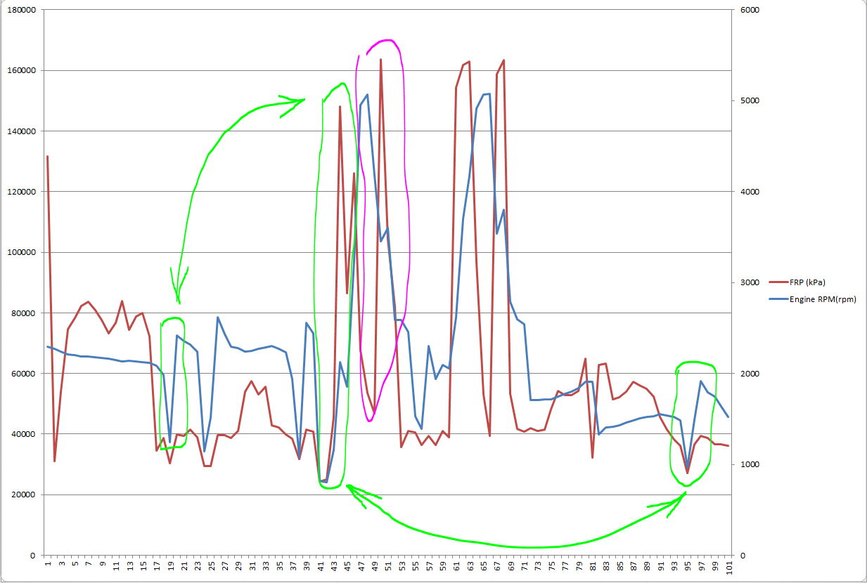 2. svetlofialovym je zaramovana totalna anomalia - pokles otacok je sprevadzany skokovym narastom tlaku paliva - toto je nezmysel, po uvolneni plynu musi tlak ihned klesat