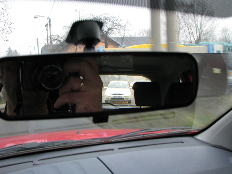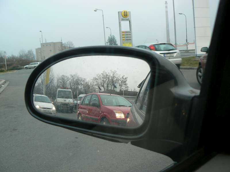 Prvni pokus o foto ze zpetneho zrcatka. Ten belous je zewl
