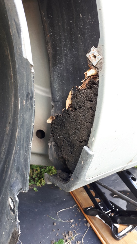 Já včera jen tak náhodou kouknul za plastový podběh předního kola a ejhle. Našel jsem tam potenciální základ pro korozi. Hroudu mokrého bláta. Přitom u spolujezdce celkem nic nebylo ale u řidiče tuna.