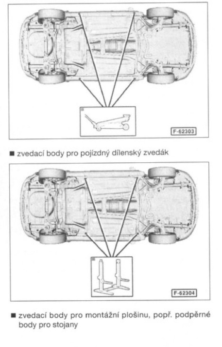 ttix: jo, hever má takovou tu ocelovou korunku, přímo zvedat to tedy nejde, poškodil by se ten protikorozní nástřik, nebo práh - lak nebo prohnul ten lem. Vepředu se to dá opřít o nosníky v podlaze, na hever pak dávám prkénko z tvrdšího dřeva, na něm kousek slabší gumy. Pro zvedání za práh mám z tvrdšího dřeva udělanou "redukci" s výkrojem do "V" přesně na práh, do toho véčka dávám dvakrát přehnutou starou duši. Jinak všechny místa pro zvedání jsou vyznačená v knize "Jak na to?", strana 127.