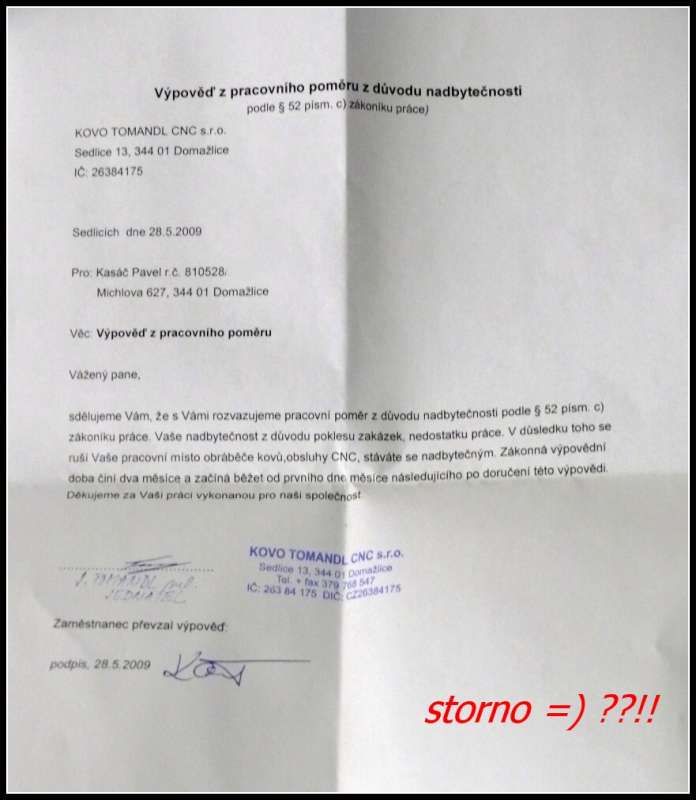 Dnes ráno v 8h telefon z práce..mistr..je možnost storno tvé smlouvy,ale za předpokladu,že půjdu ne na frezu jako doposud,ale na soustruh což je mě ůplně jedno..tak to vypadá zatím slibně a zítra se to bude projednávat jako smlouva a tak..pokud nedostanu smlouvu,jako doposud nemá to cenu tam být a navíc bych přišel o odstupné což by mě mrzlelo po 6 letech..