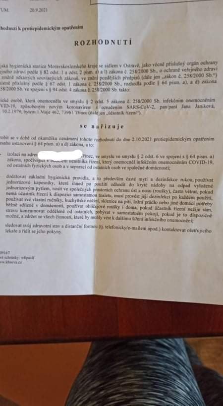 Kámošce (pozitivní v karanténě ) poslala hygiena pokyny, jak se má v karanténě chovat. Doporučeně a do vlastních rukou. :dih: