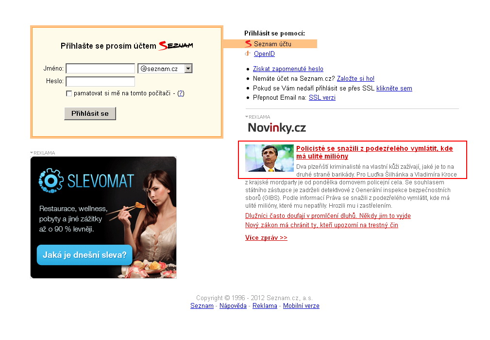 Dnes rano odkazy na zpravy ze seznam.cz na novinky.cz (v cervenem ramecku). Tesil jsem se na nejake zajimave zpravy, ale prekvapeni se nakonec nekonalo ...