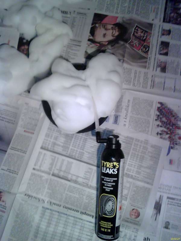 Špatná zpráva je že to je úplně nahovno. Ta pěna je mírně lepkavá, zůstává pěnou celé hodiny a hlavně to nic neucpe ani nezalepí. Napumpoval jsem do té duše cca půlku, všechno stejně hned vylítalo ven a ani po čtyřech hodinách to nezatuhlo natož aby to snad ucpalo tu dírku - ta zůstala
