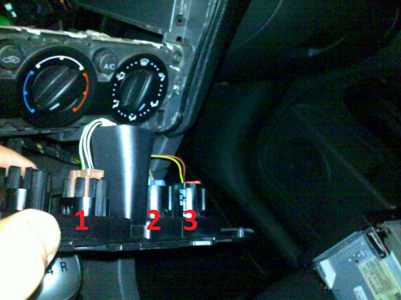 Po vyšroubování tlačítek sem nicméně objevil konektor 1. vedoucí do záslepky. Předpokládám, že by mohl být pro ohřev předního okna? 2. je zadní okno 3. je signalizace airbagu spolujezdce.