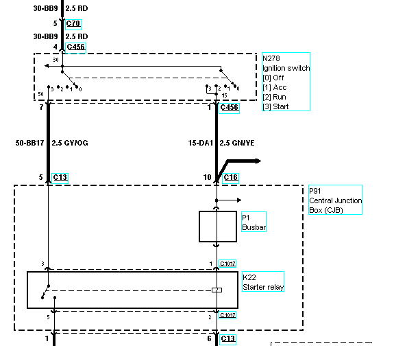 zkus propojit 4+1+6 (pozice II) a pak pro start pripoj 7 (po nastartovani odpoj)